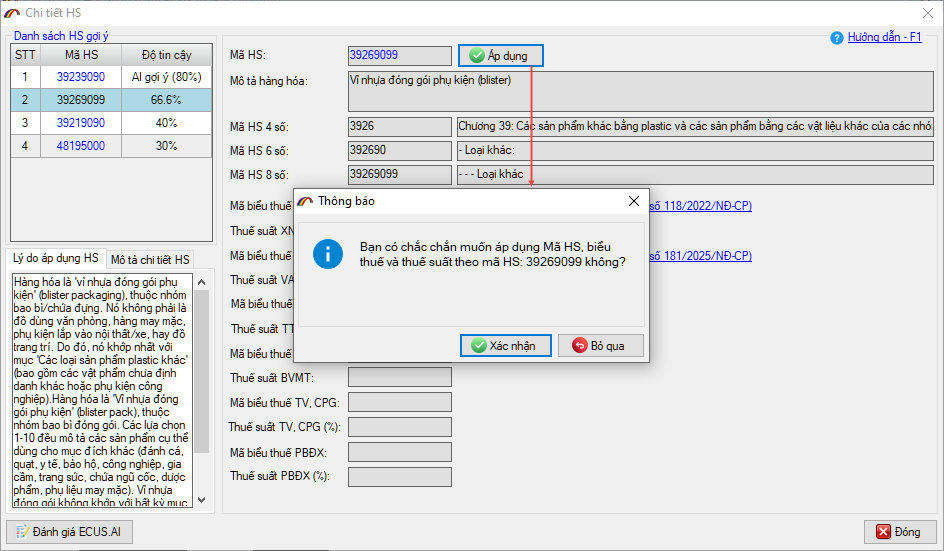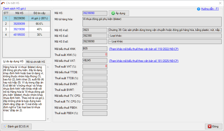 Phía bên trái màn hình là danh sách các HS gợi ý kèm theo độ tin cậy, khi nhấn vào HS gợi ý, phía bên phải màn hình sẽ hiện ra các thông tin chi tiết liên quan như: Tên mô tả hàng hóa theo Chương, theo HS 4 số, 6 số và 8 số, cùng với mã biểu thuế XNK, thuế GTGT, các loại thuế nhập khẩu bổ sung khác kèm văn bản pháp luật để người dùng xem thông tin. Nếu thấy HS gợi ý nào phù hợp, đúng với thông tin hàng hóa hơn so với HS do AI tự xác định, người khai chọn và nhấn nút Áp dụng để thay thế.