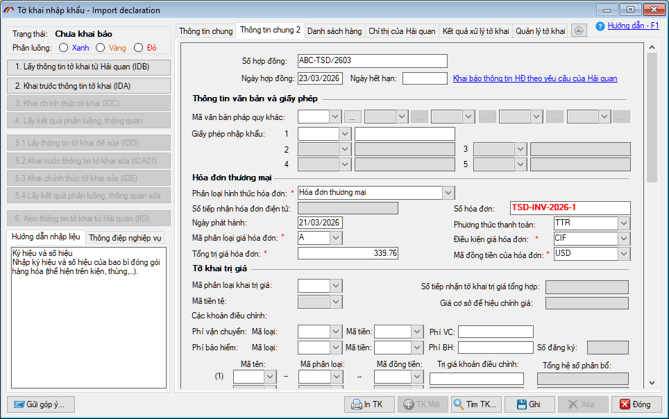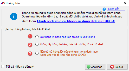 Lựa chọn 2: Không lấy thông tin hàng hóa trên chứng từ vào tờ khai.