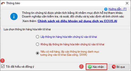 Cuối cùng, người khai đánh dấu tích chọn vào mục Tôi đã hiểu và đồng ý, sau đó nhấn nút Xác nhận để phần mềm tạo tờ khai Hải quan.