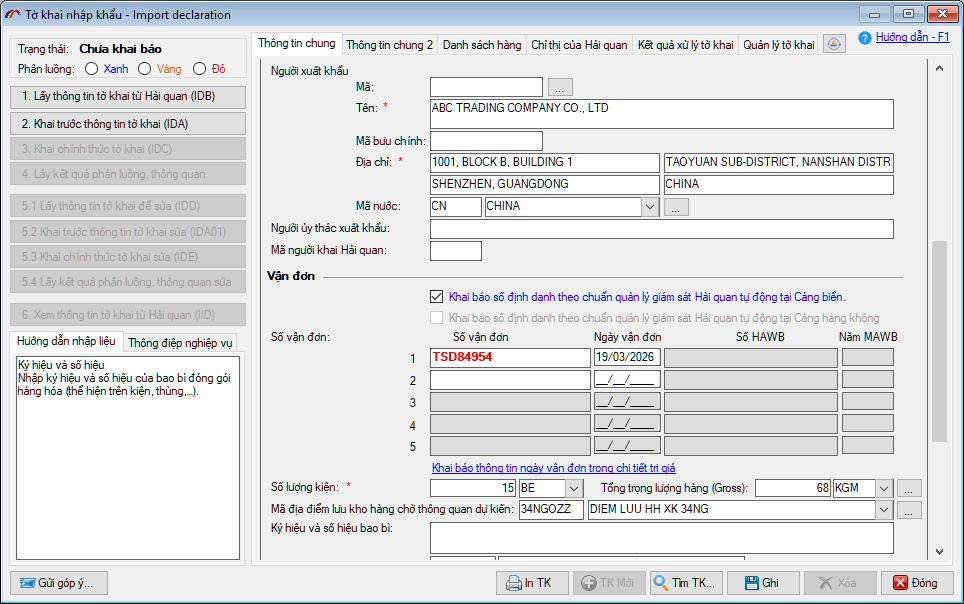 Thông tin tờ khai: Được hệ thống tự động điền vào các chỉ tiêu thông tin từ kết quả phân tích như: Mã hiệu phương thức vận chuyển, thông tin đối tác, vận đơn, hóa đơn, cảng cửa khẩu xếp dỡ hàng…