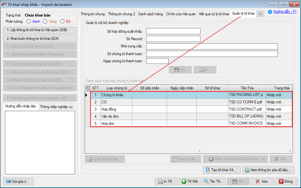 Sau khi tờ khai được khai báo, người khai có thể khai các chứng từ đính kèm này ngay mà không cần phải nhập dữ liệu.