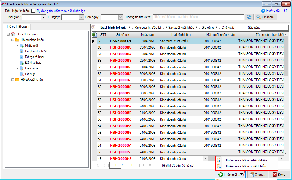 Thêm mới hồ sơ nhập khẩu là chức năng để người khai thực hiện phân tích chứng từ và tạo tờ khai Hải quan cho hồ sơ nhập khẩu. Người khai truy cập vào menu Hồ sơ hải quan / Thêm mới hồ sơ nhập khẩu:
