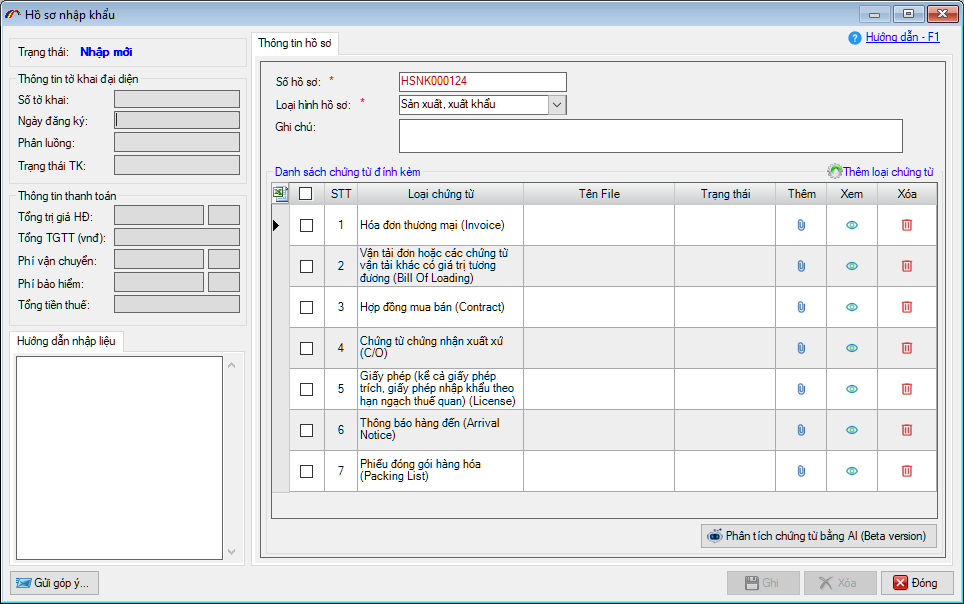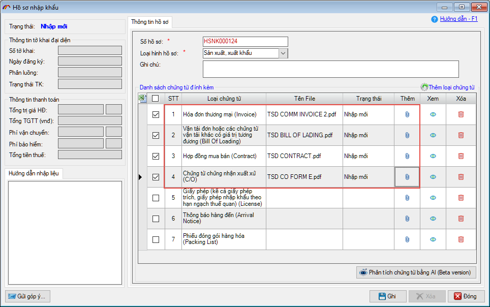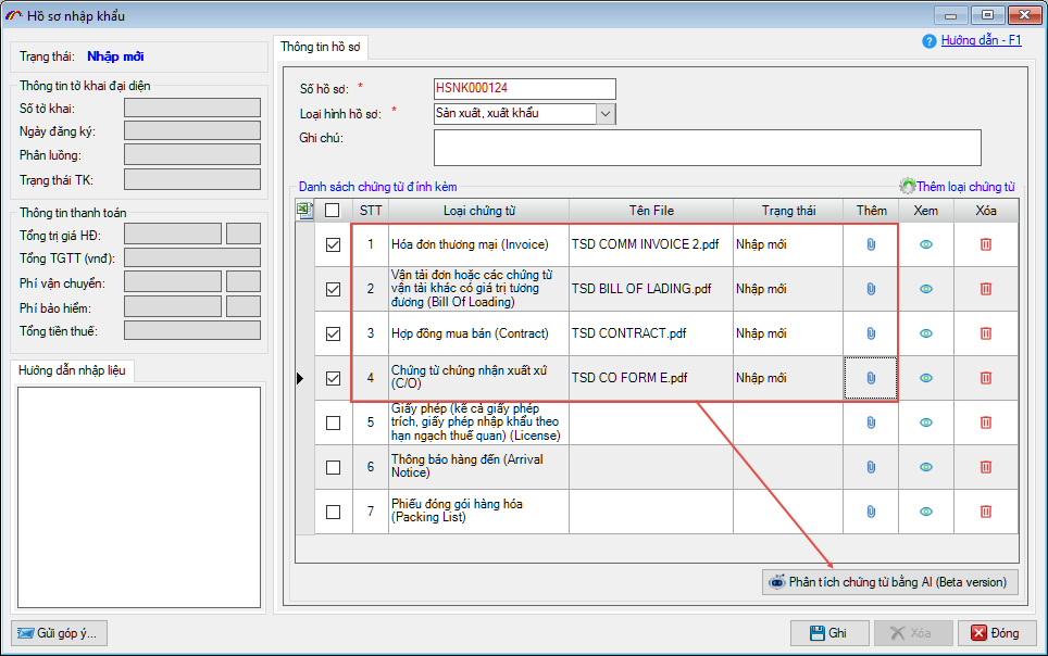 Khi đã đính kèm các file chứng từ của hồ sơ, người khai nhấn vào nút Phân tích chứng từ bằng AI:
