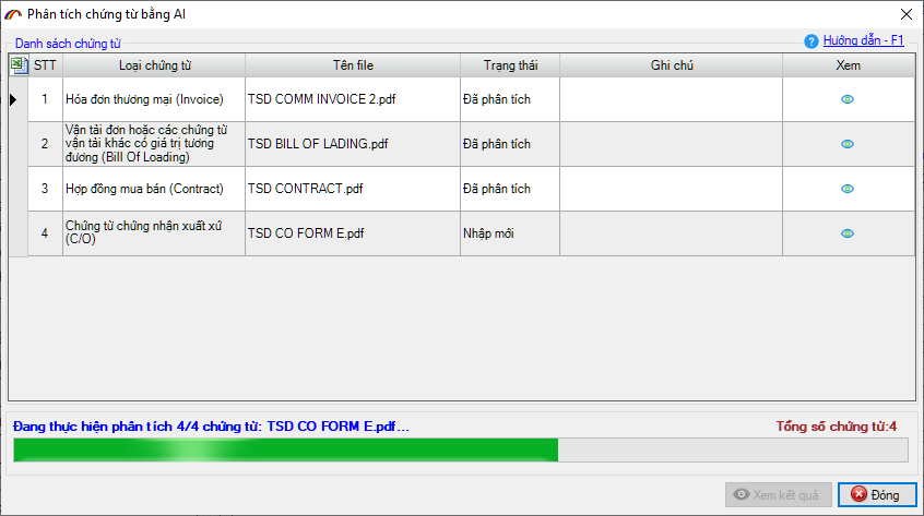 Khi quá trình phân tích kết thúc, người khai nhấn Xem kết quả (có thể xem chi tiết kết quả phân tích từng chứng từ bằng cách nhấn vào biểu tượng tại cột Xem):