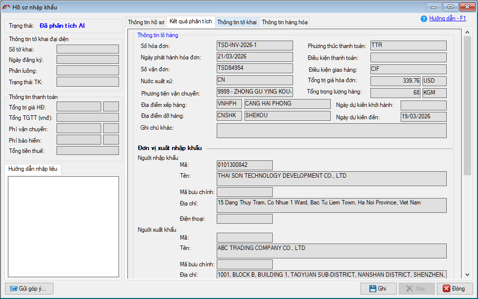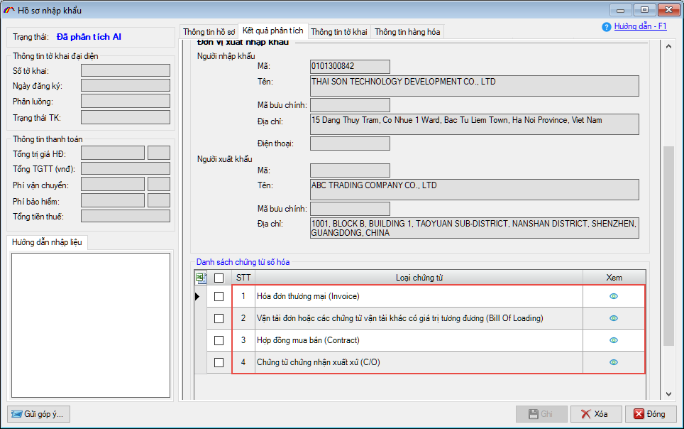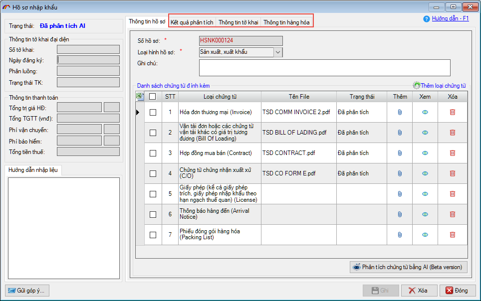 Lúc này sẽ quay về màn hình hồ sơ ban đầu, có thêm các tab Kết quả phân tích, Thông tin tờ khai và Thông tin hàng hóa: