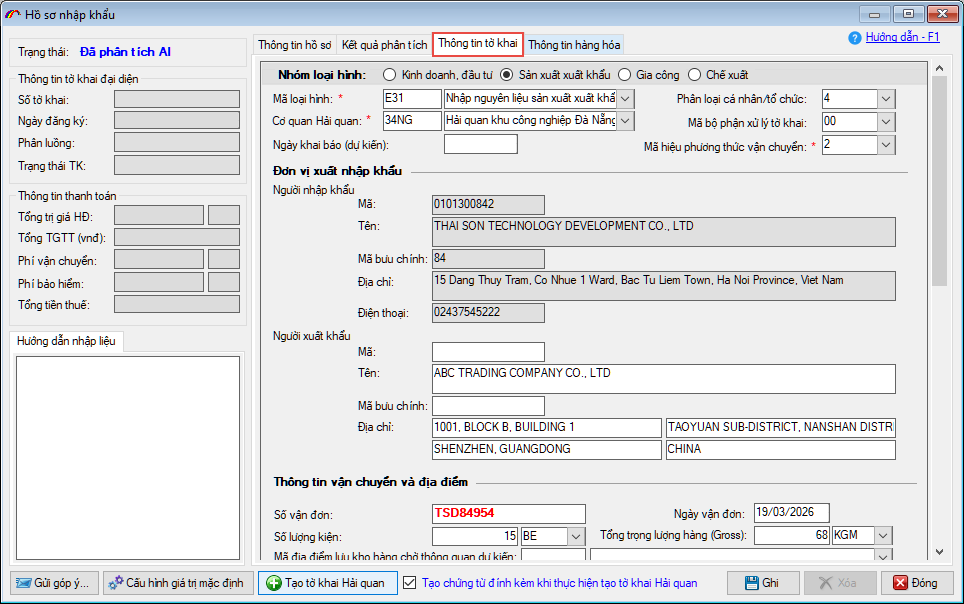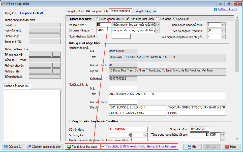 Bước 3 – Kiểm tra kết quả phân tích và tạo tờ khai Hải quan.