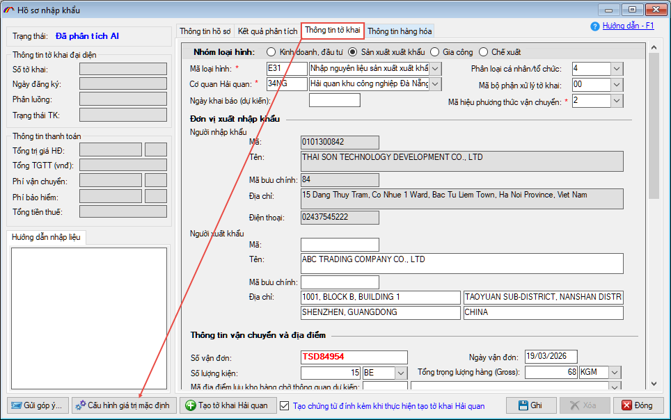 Sau khi phần mềm tạo tờ khai thành công, hệ thống sẽ đưa các kết quả phân tích vào chỉ tiêu thông tin tương ứng trên tờ khai, người khai kiểm tra, xác nhận các tiêu chí thông tin và tiến hành khai báo lên cơ quan Hải quan (