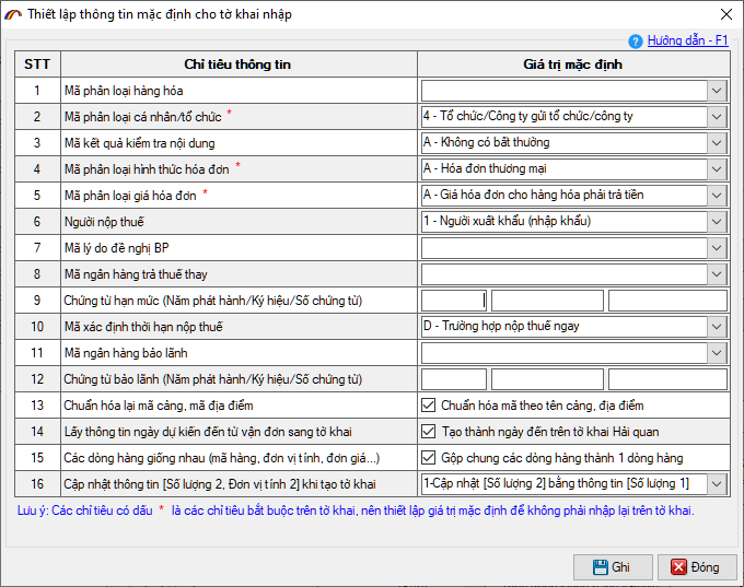 - Các tiêu chí có dấu * màu đỏ là các chỉ tiêu bắt buộc trên tờ khai, người dùng nên thiết lập.