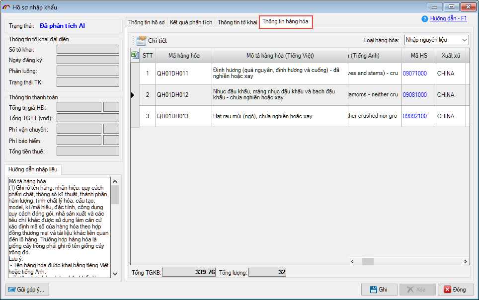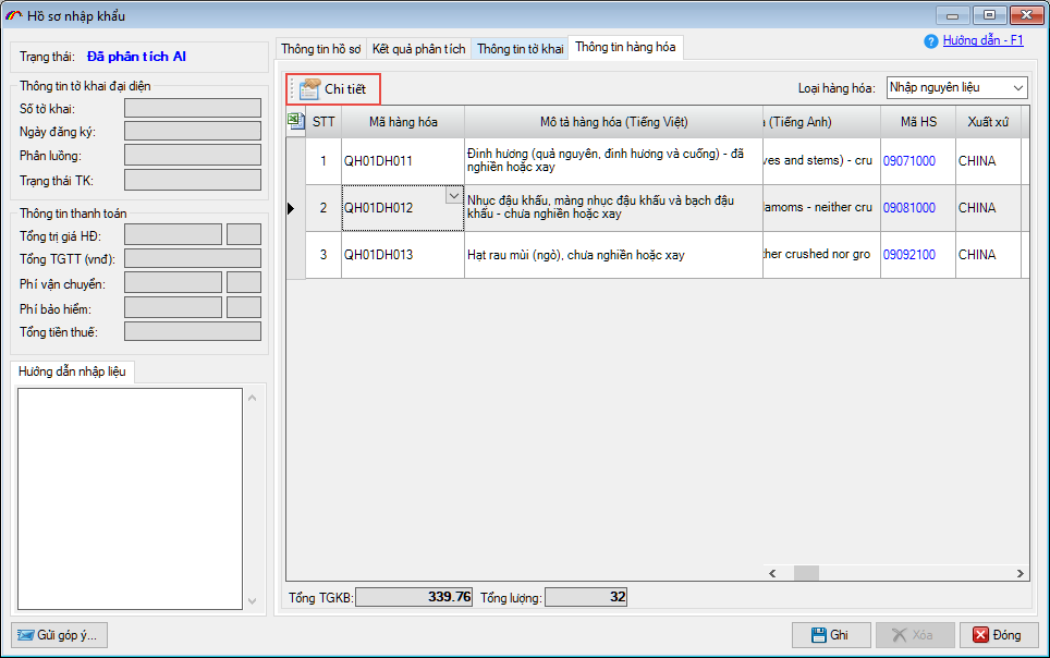 Thông tin danh sách hàng của tờ khai: