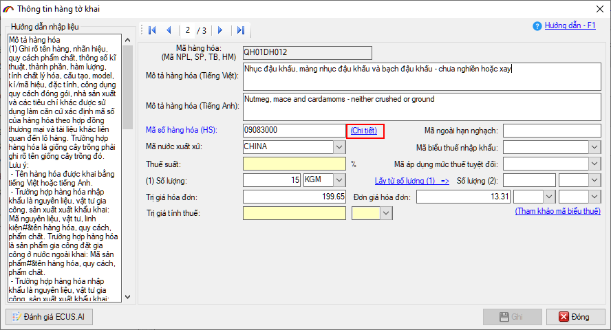Tiếp tục nhấn nút Chi tiết tại chỉ tiêu mã số hàng hóa (HS):